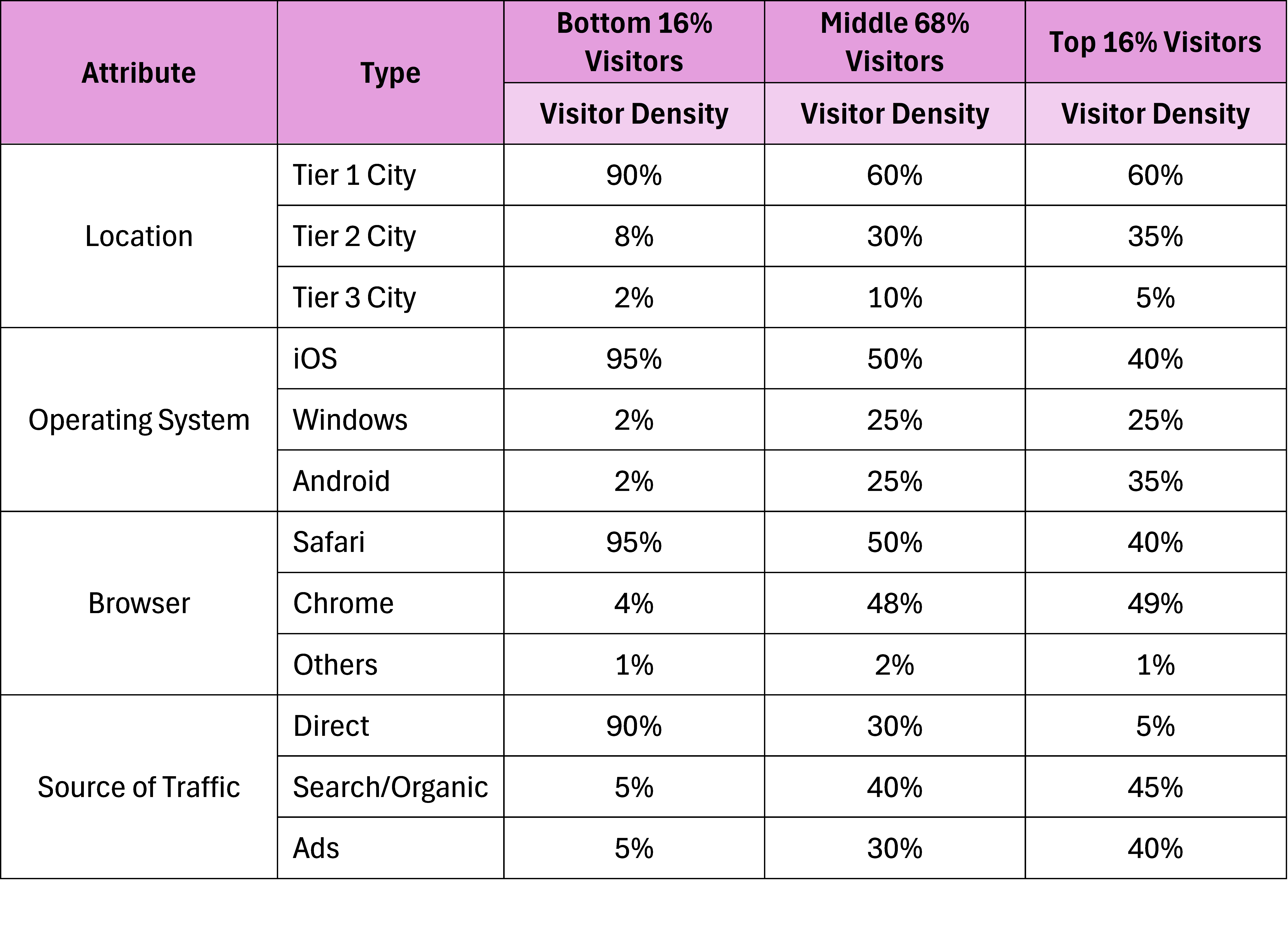 From the above table, it is evident that visitors from a particular segment of the curve have a lot of similarities. Based on these similarities and other data points more commonalities can be drawn between the visitors depending on the segment they are a part of, such as: