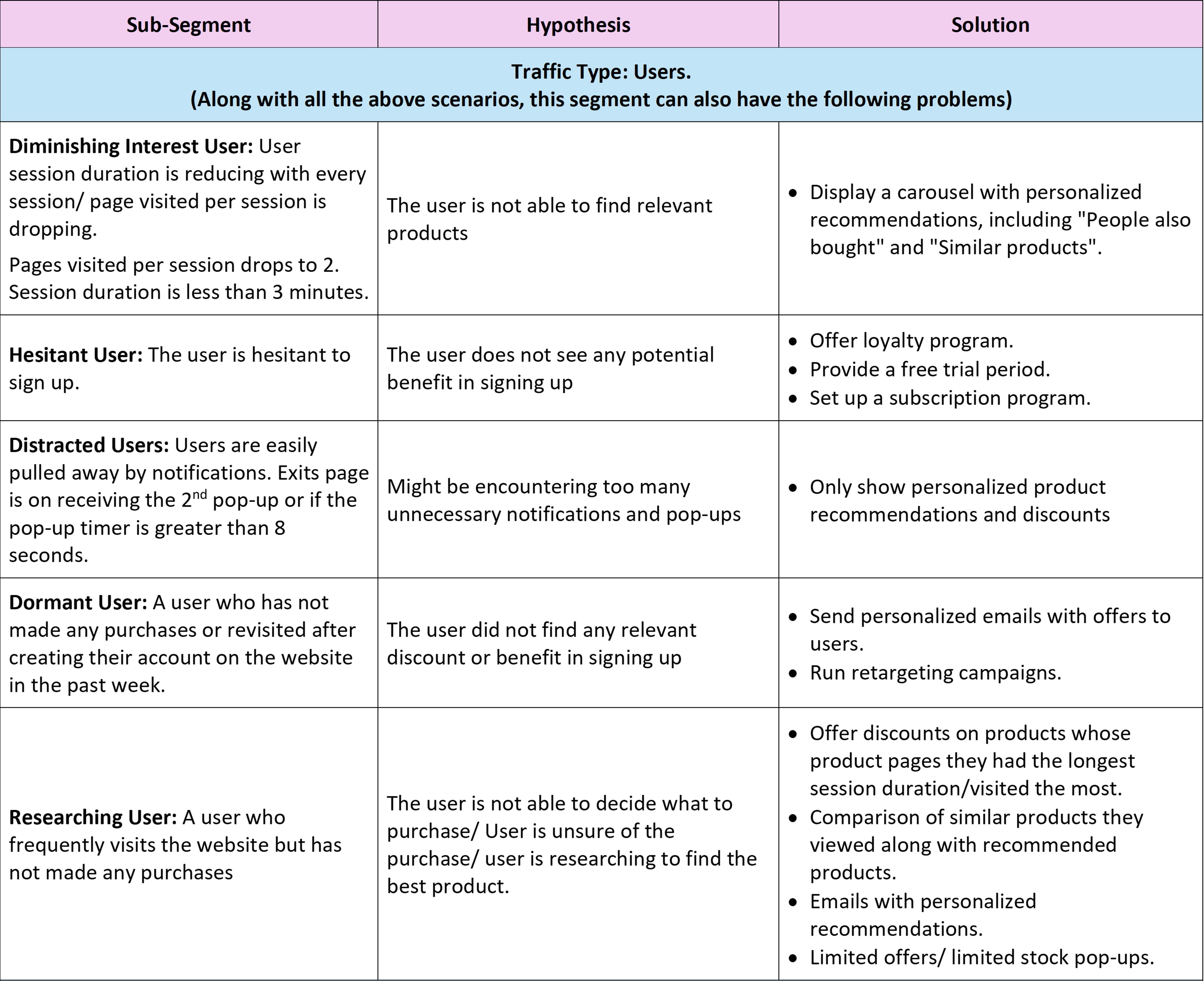 These factors can manifest in various scenarios, such as visitors having short session durations, or abandoned carts. Businesses must leverage their data-driven segmentation to address these issues and drive revenue growth. These pain points will, however, remain similar to visitors within a segment. Post this, they can investigate the underlying reasons or root causes behind the hypothesized scenarios and develop tailored solutions to address the identified root causes for each segment.