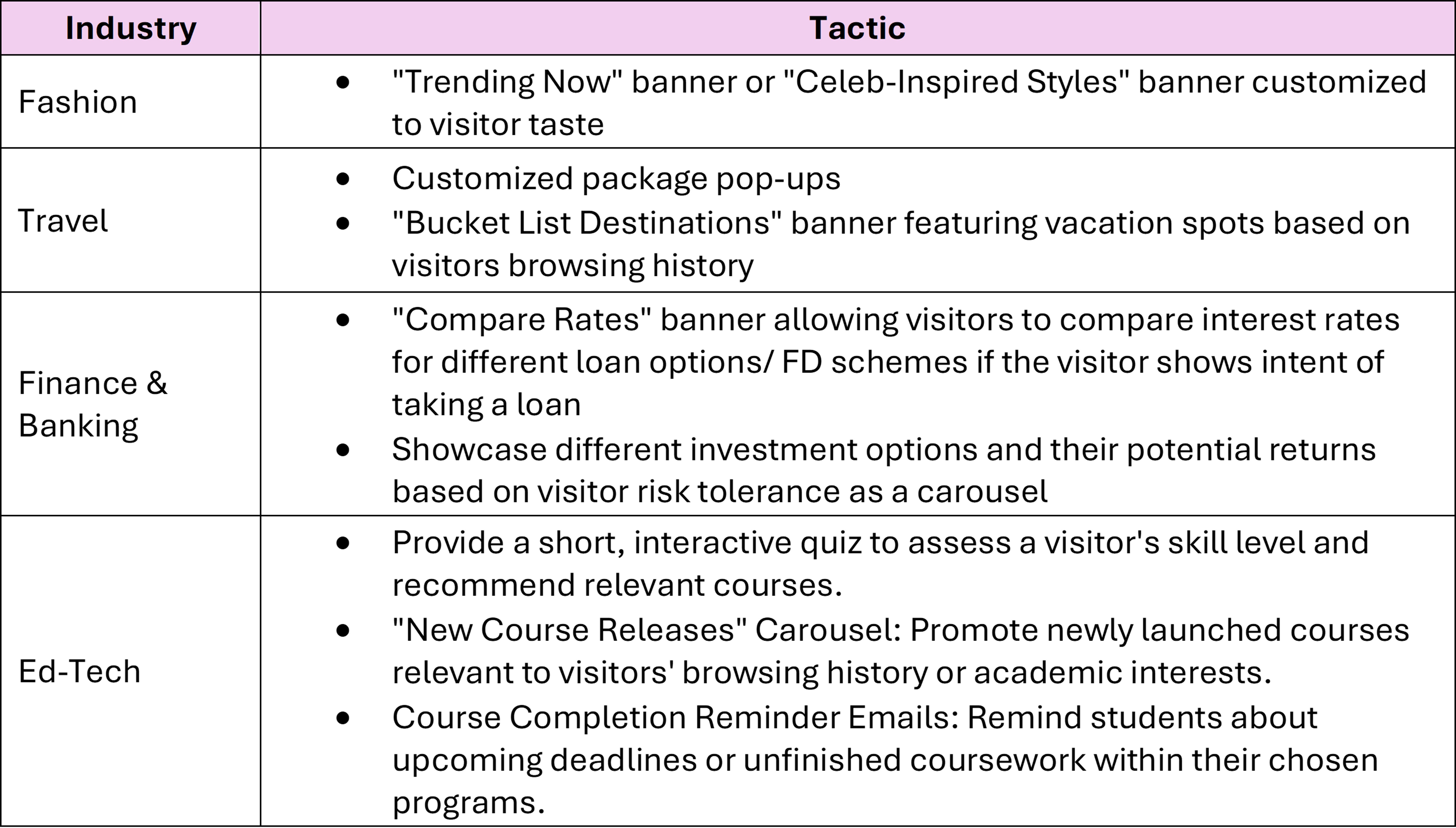 All the above-mentioned tactics can be further personalized based on industry, for example: