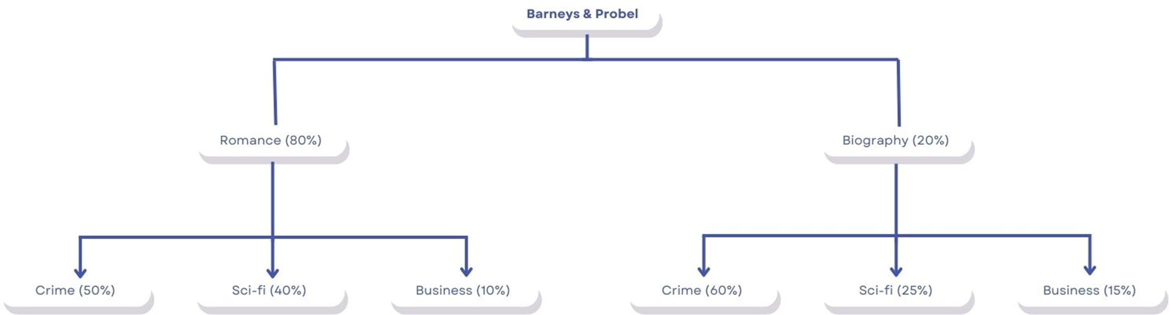 The brand has noticed that when a “Multi-genre” customer visits the website, there is a 80% probability that they will pick a romance book and a 20% probability that they will pick a biography. The brand also analyzed that after ordering a romance book, the probability of ordering crime, sci-fi, and business books are 50%,40%, and 10%, respectively. While after ordering a biography, the probability of ordering crime, sci-fi and business books are 60%, 25%, and 10%, respectively.